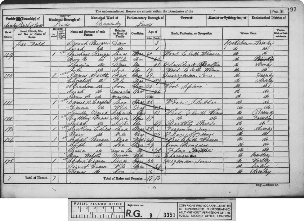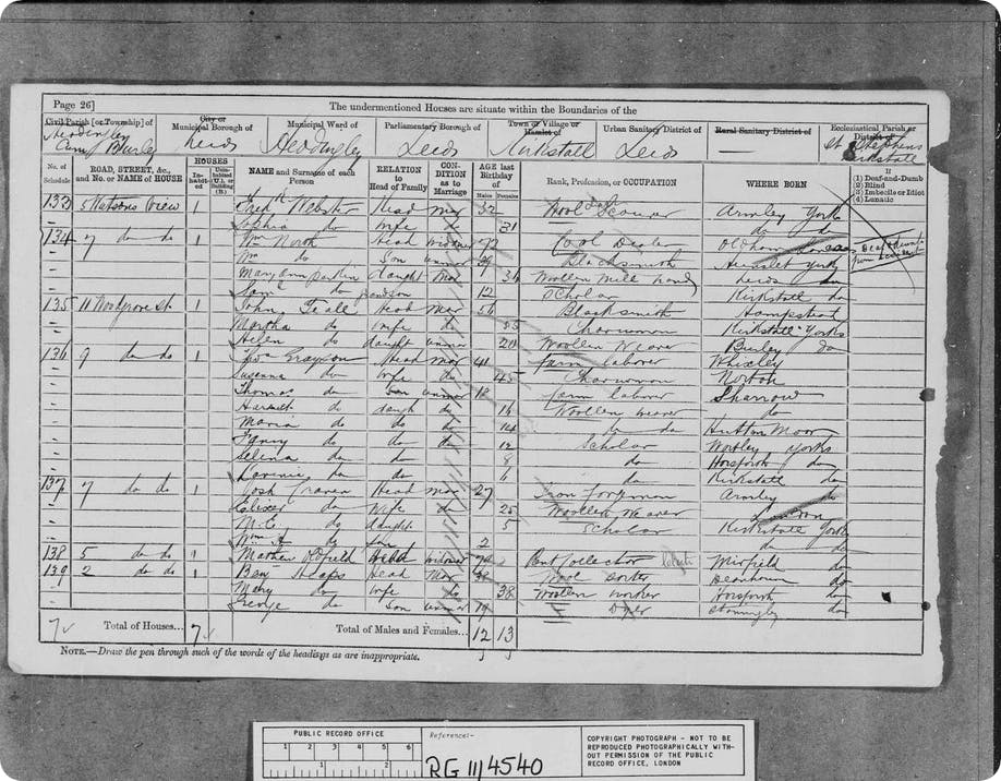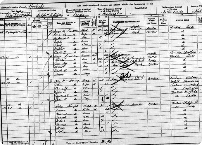 The family were at 7, Woodgrove St, Headingley With Burley with Joshua aged 27, an iron forgeman, Eliza, 25 and a woollen weaver and two children, Mary, five and son William H, then only two: