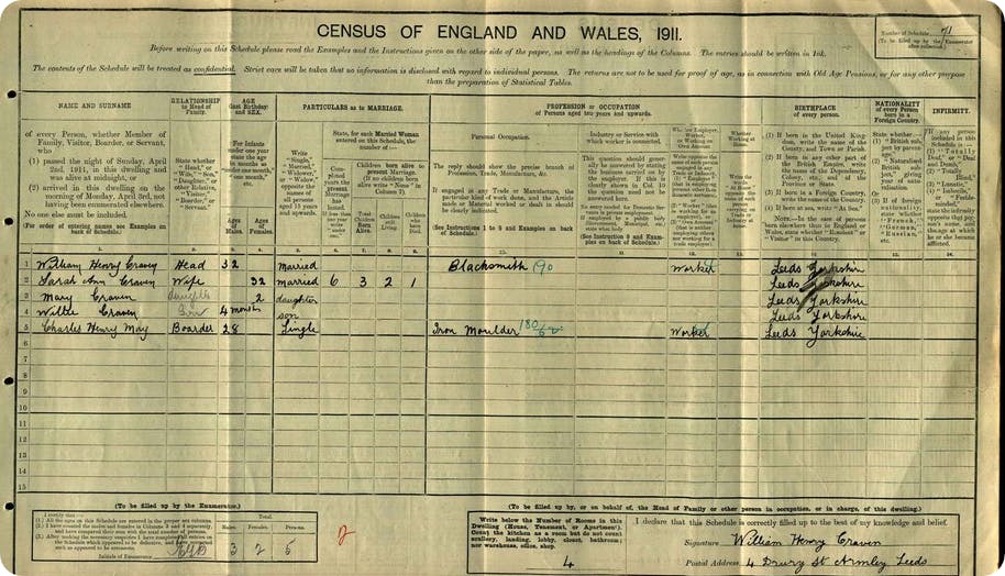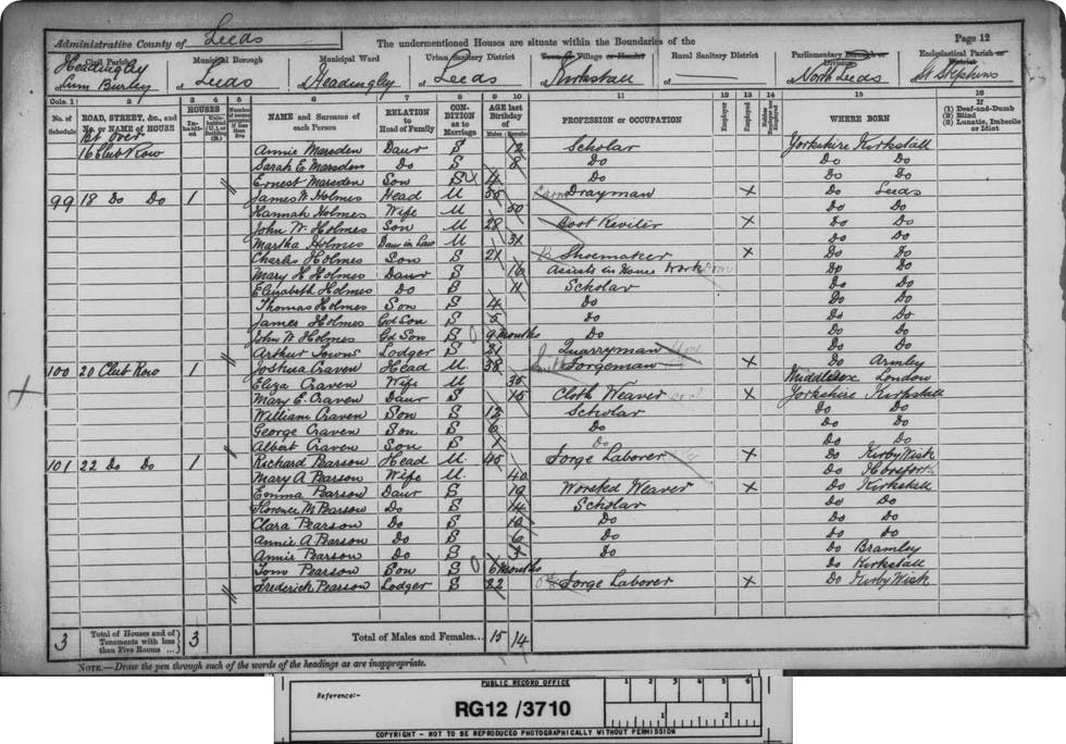 Also in the household was Willie’s older sister, Mary, two, and a boarder, Charles Henry May, 28, an iron moulder and the brother of Sarah Ann Craven whose maiden name was May. The whole family gave their birth place as Leeds.