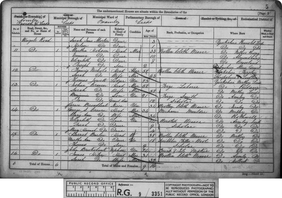 Harriet was a widow, which meant I had to go to the census of 1861 to try and discover who Joshua three’s father was. Living at Far Fold, Armley, Leeds was the family of Joshua and Harriet Craven with a family of three sons and two daughters including Joshua Jr, born in 1854 at Armley. The family are spread over two pages in the census: