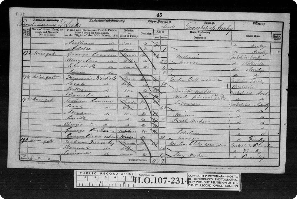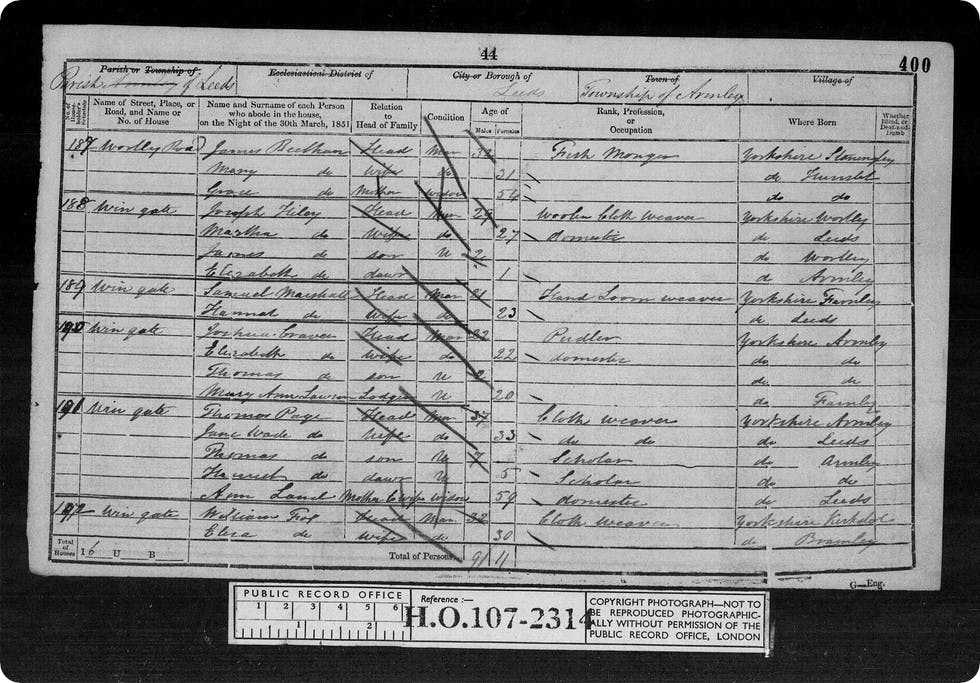 The father of Joshua two – Joshua one – was also found in the 1851 census living near his son, also at Wingate, Armley. The two Joshuas appeared on adjacent pages and were just a few doors from one another: