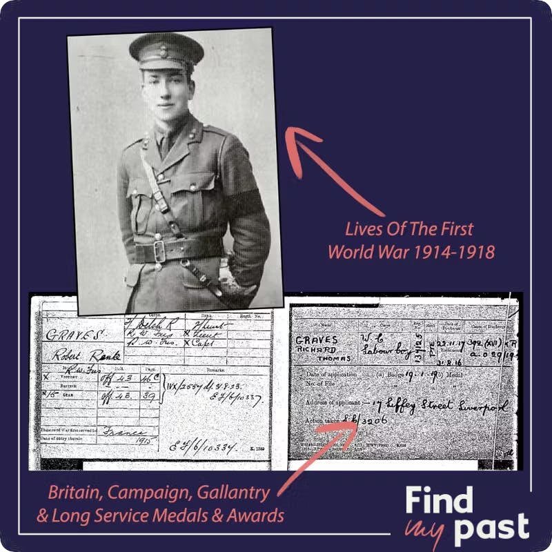 A photo of Robert Graves from the Lives of the First World War collection, alongside two of his medal cards.