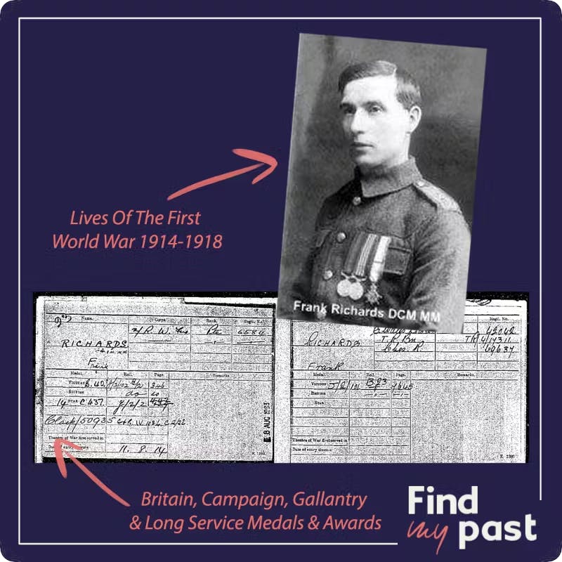 A photo of Frank Richards from the Lives of the First World War collection, alongside two of his medal cards.