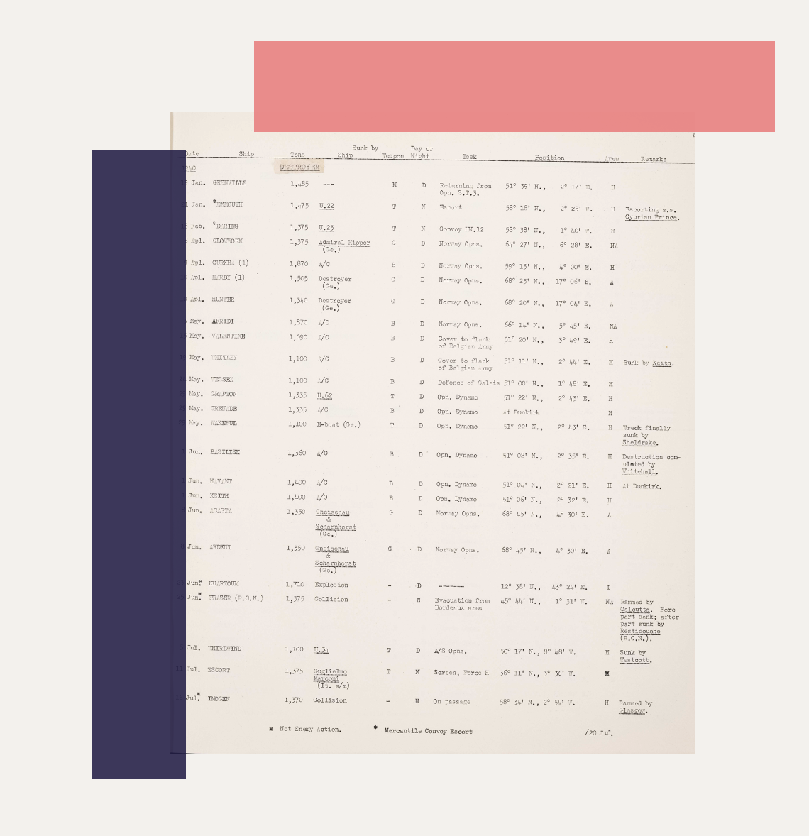 This collection documents those warships lost during the Second World War, recording vessels destroyed by enemy action, accidents, or operational hazards between 1939 and 1945. These records can provide vital information that gives context to your naval ancestor's experience during the Second World War, including how and where their ship was lost.