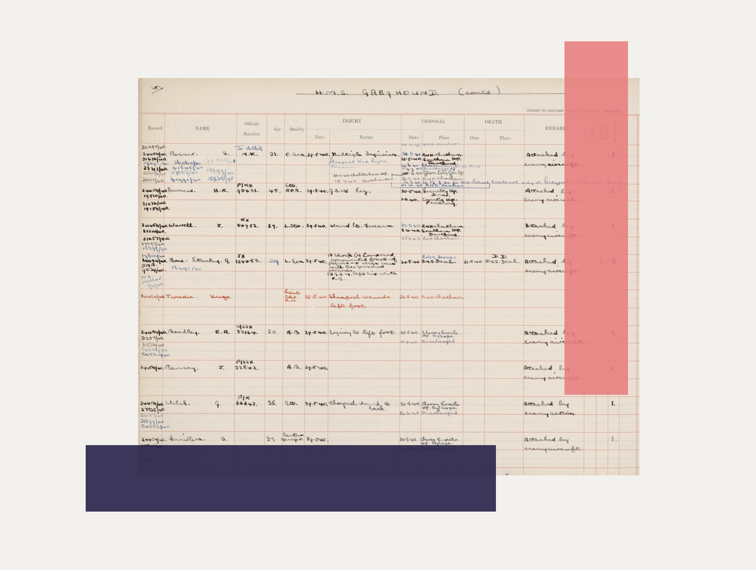Delve deeper into your family history by exploring this collection of Royal Navy Casualty Logs to discover more about your ancestors who served in Britain's Royal Navy during the Second World War. These records document Royal Navy ships that were lost, damaged, or involved in serious incidents and record events such as sinkings, enemy attacks, collisions, groundings, and mine strikes.
